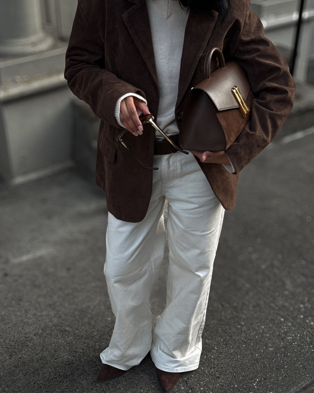 The Arianna Suede Panel Satchel Handbag is defined by its clean lines and material interplay. A pane of tactile suede is set into a structured leather body, creating a quiet contrast in texture and finish.