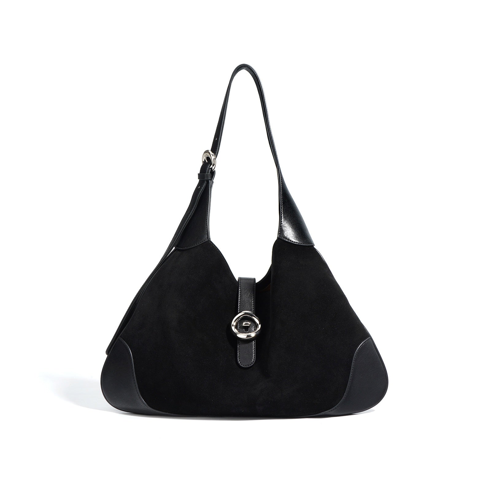 The Breanna Suede-Leather Combo Hobo Bag finds its form in the interplay between smooth leather and soft suede. Its unstructured crescent silhouette drapes from the shoulder, held by a wide strap and secured with a quiet magnetic closure. A companion for moments that value texture and quiet composition.