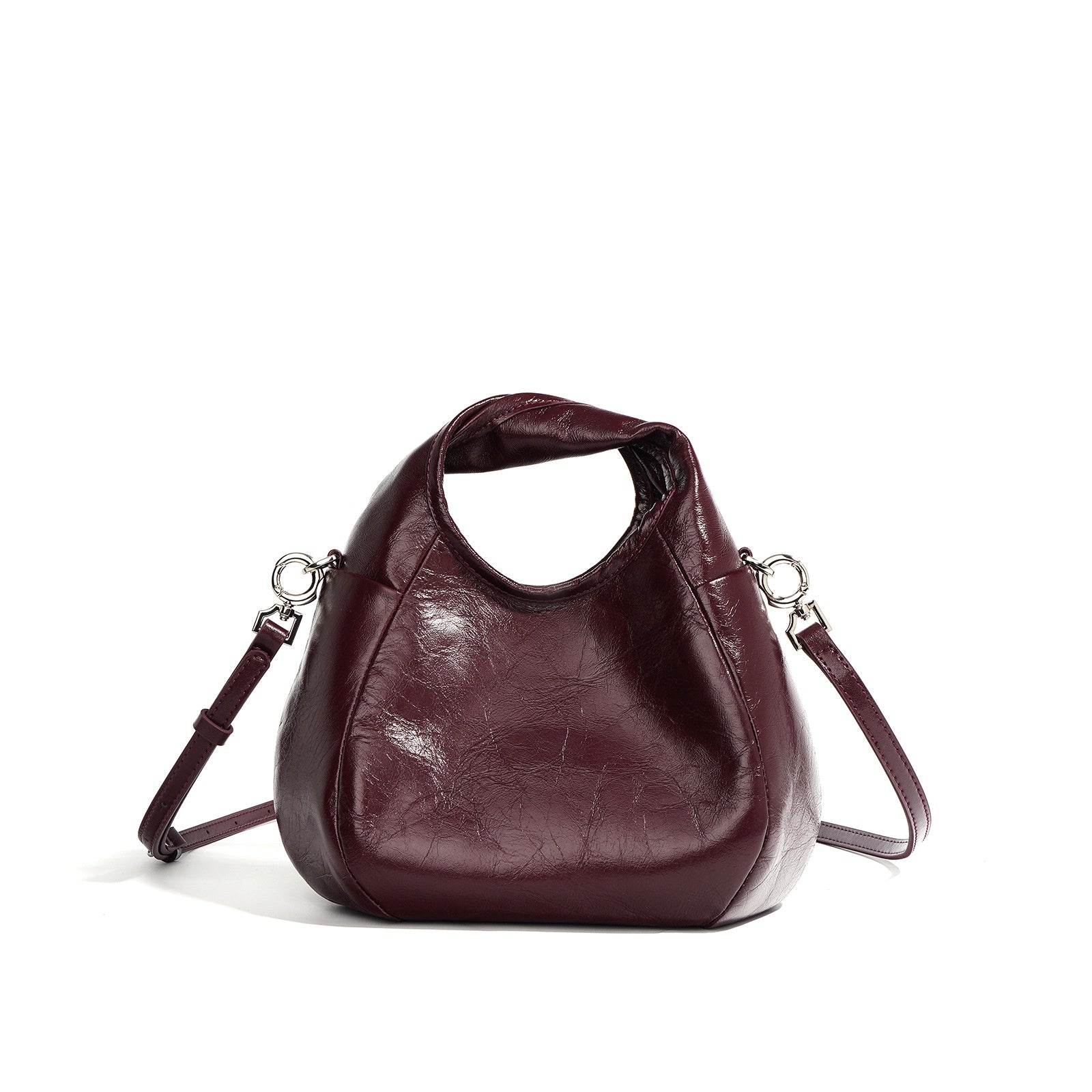 The Victoria Glazed Leather Hobo Bag is shaped from glazed leather, its fluid crescent form achieved through considered construction. The material’s subtle luster catches the light, tracing the soft folds of its relaxed structure. A discreet magnetic closure secures the top, and the shoulder strap is seamlessly integrated into the body of the bag.